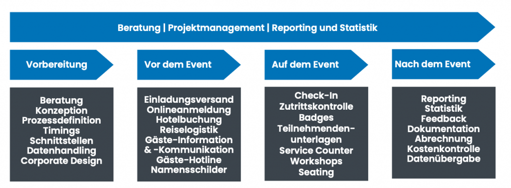 • Erfassung der Gäste vor Ort • Ausweis- / Namensschilder-Druck in versch. Formaten und Ausführungen • Teilnehmendeninfos per QR-Code • Personalisierte Teilnehmendenunterlagen • Anwesenheitslisten, Hotelübersichten etc. • Onlineumfragen